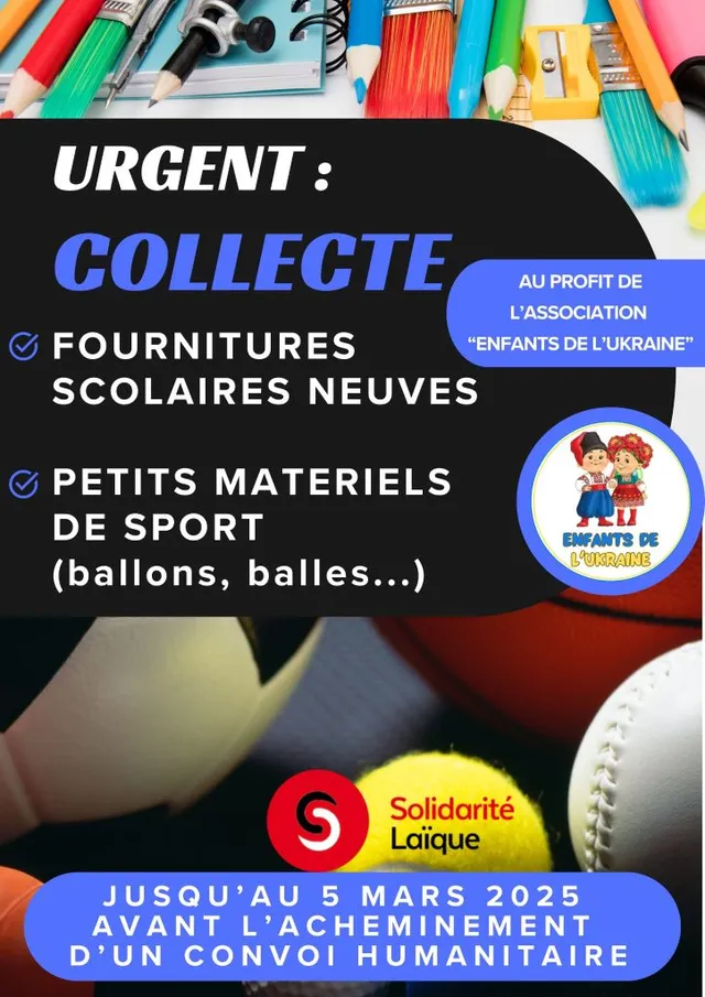 La MAIF du Calvados s'associe à ses partenaires de Solidarité Laïque pour vous proposer de participer à une collecte solidaire au bénéfice des enfants d'Ukraine. Vous pouvez venir déposer en délégation des fournitures scolaires neuves ou du petit matériel de sport. Vos dons seront envoyés en Ukraine début mars par camion. Merci de déposer vos dons avant le 5 mars.