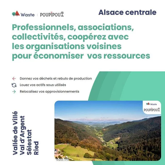 L'association POUPIPOU a lancé en 2025 la plateforme d'économie circulaire Ty Waste Alsace centrale, pour les associations, pros et collectivités. Elle répertorie les offres et demandes de ressources des organisations établies dans les 4 Comcom d'Alsace centrale.