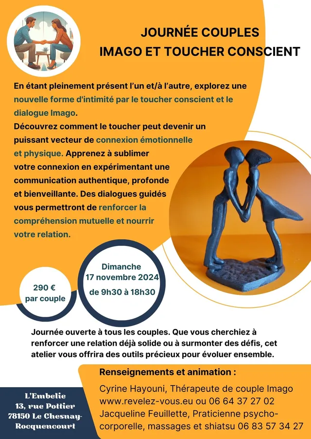 Je mets de la magie dans ma relation  amoureuse ! Série de 5 Ateliers IMAGO réservés aux couples Venez expérimenter en couple des outils concrets pour mieux écouter et comprendre votre partenaire dans la joie et la sécurité. A travers des dialogues axés sur le positif, découvrez ou pratiquez l’approche relationnelle Imago pour développer une relation consciente et une nouvelle façon d’aimer ! 20% de réduction pour tous les sociétaires de la MAIFPour en savoir plus, c'est ici : https://revelez-vous.eu/serie-de-5-ateliers-imago-reserves-aux-couples Au plaisir de vous rencontrer! Cyrine HAYOUNI Thérapeute de couple Imago certifiée